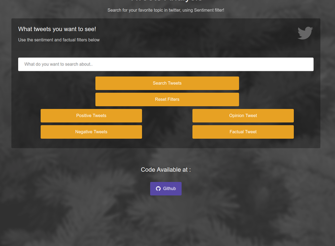 Photo by Toa Heftiba on Unsplash Twitter Sentiment analysis Last updated on Jan 1, 0001 Go to Project Site Photo by Toa Heftiba on Unsplash Twitter Sentiment analysis Last updated on Jan 1, 0001 Go to Project Site NLP Python JavaScript